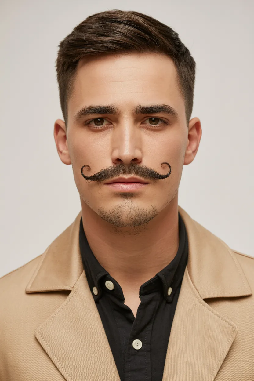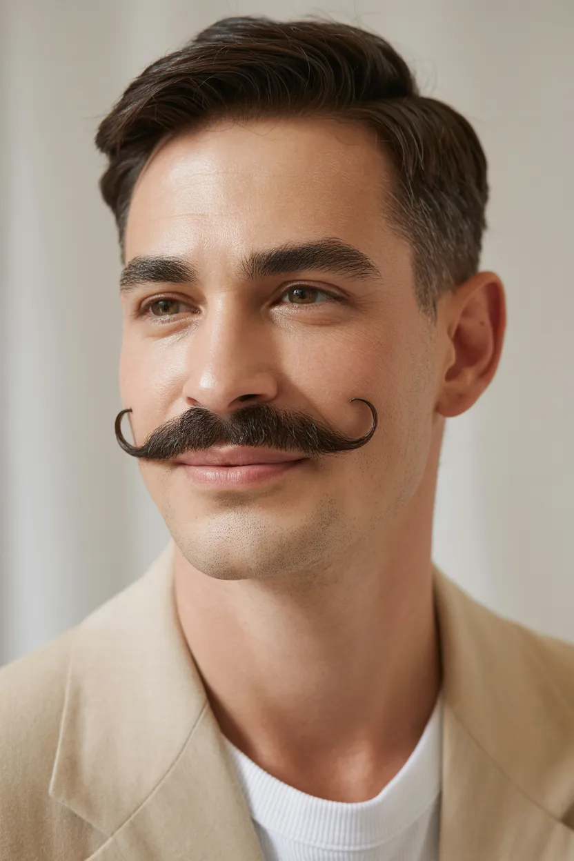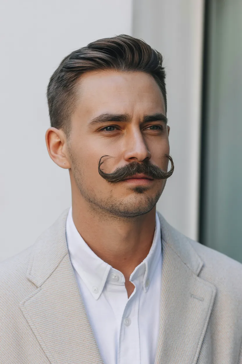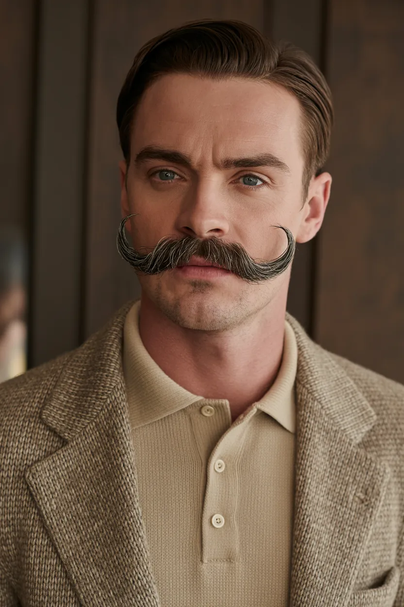 This mustache suits men who actually enjoy grooming. You need attention to detail here. You may use wax, a comb, and regular trimming to keep the ends clean and directed. But if you like polished style, that effort pays off.