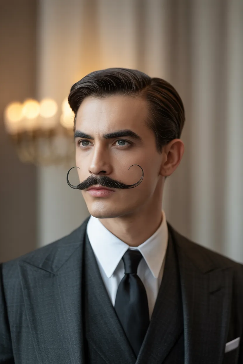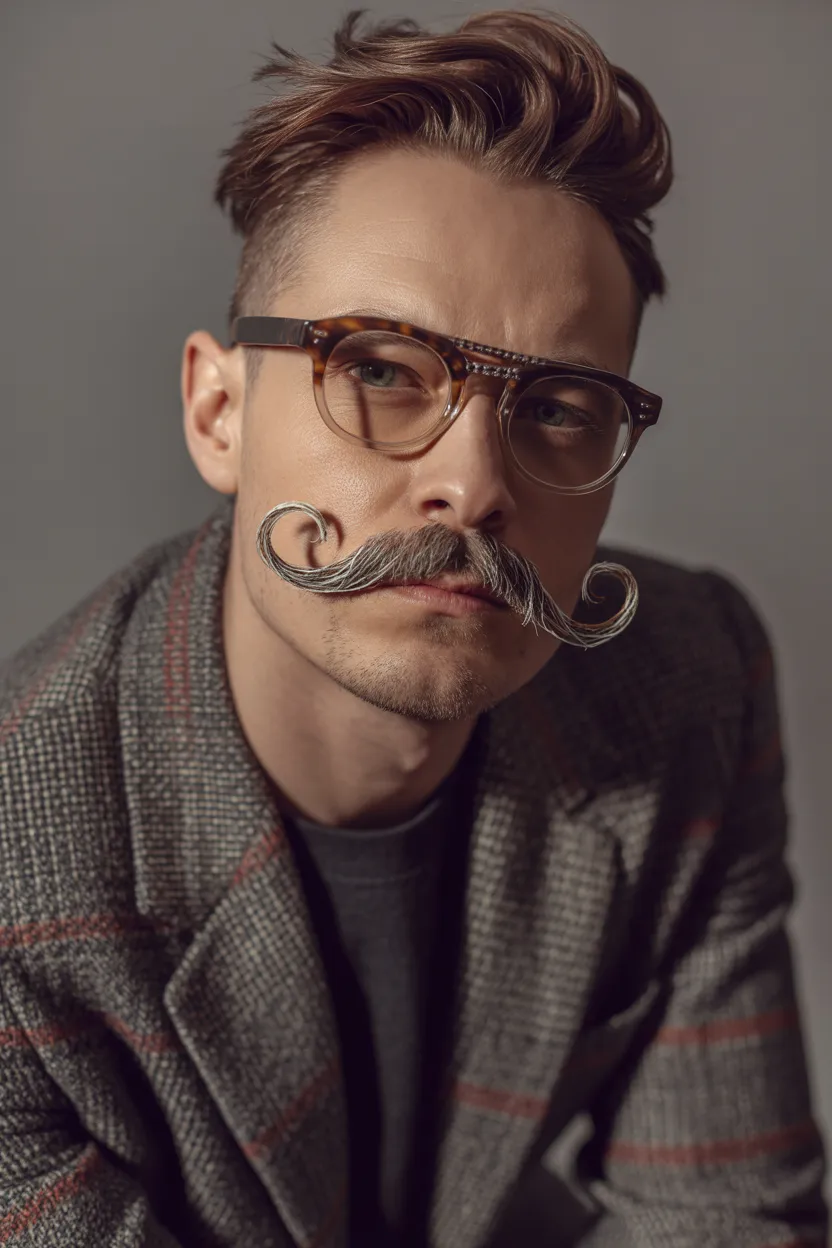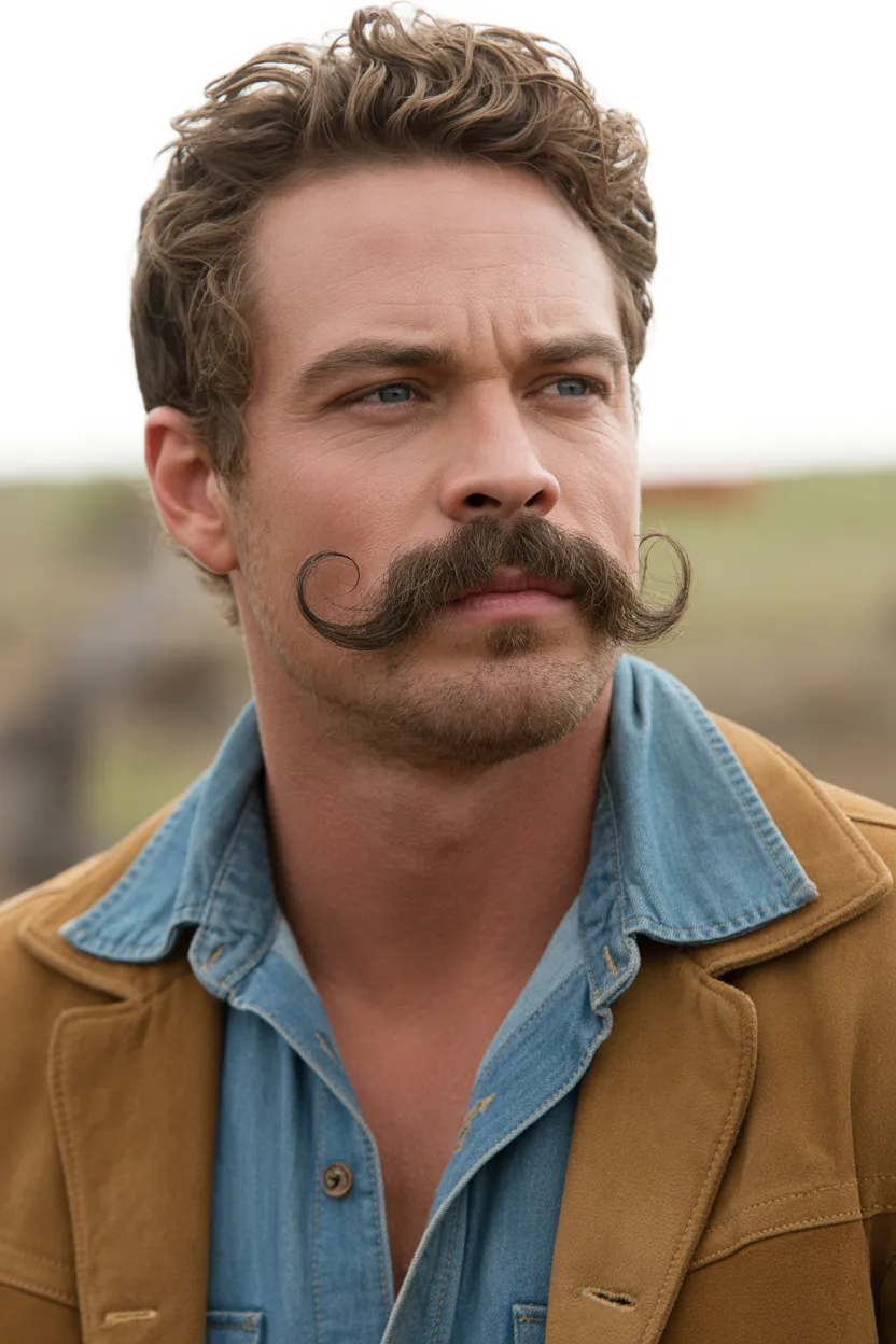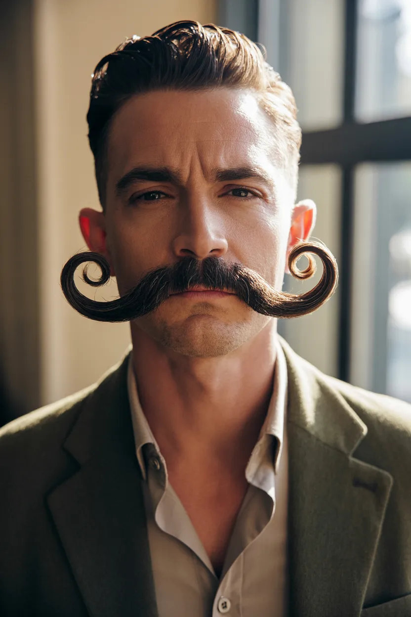 This mustache suits men who actually enjoy grooming. You need attention to detail here. You may use wax, a comb, and regular trimming to keep the ends clean and directed. But if you like polished style, that effort pays off.