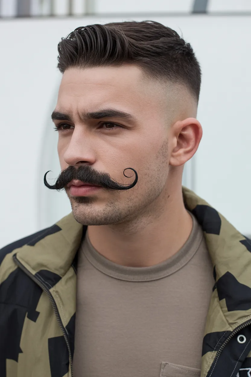 Haircuts and mustaches should work together. A fade can make a fuller mustache look more current. Slightly longer textured hair can make a rugged mustache feel cooler. Clean classic haircuts pair really well with Chevron, Pencil, and Military styles.