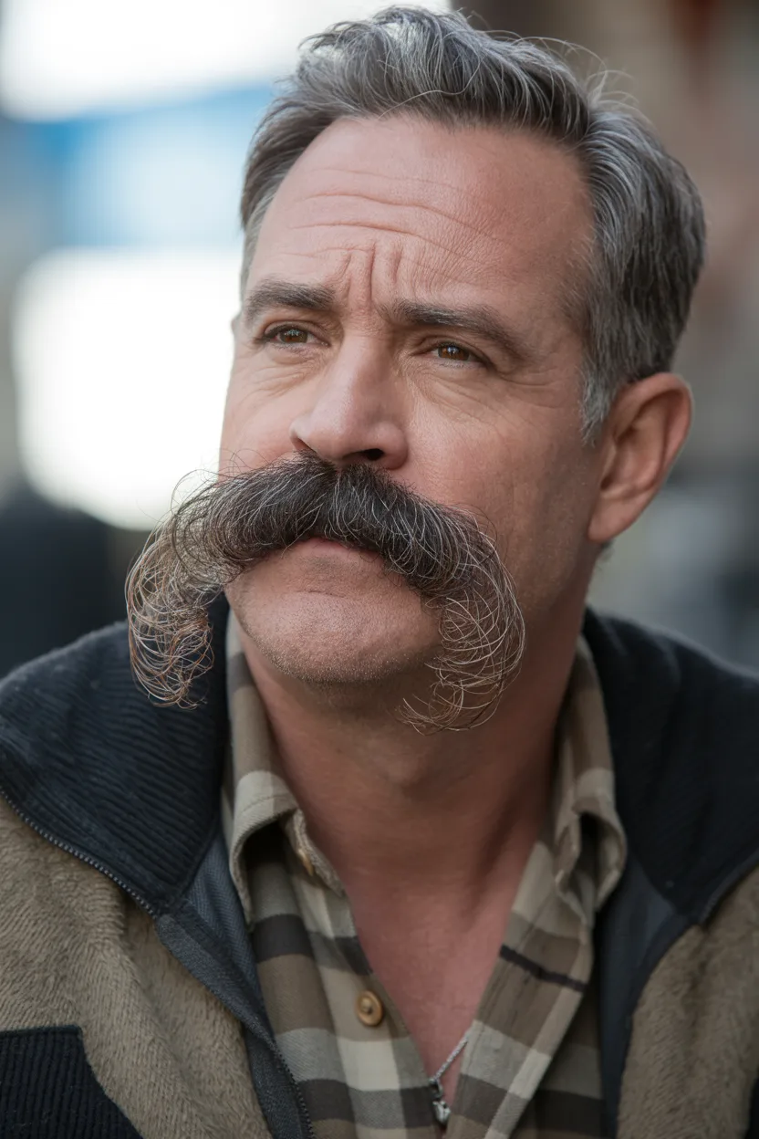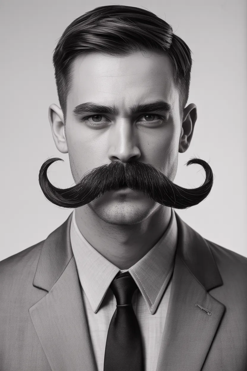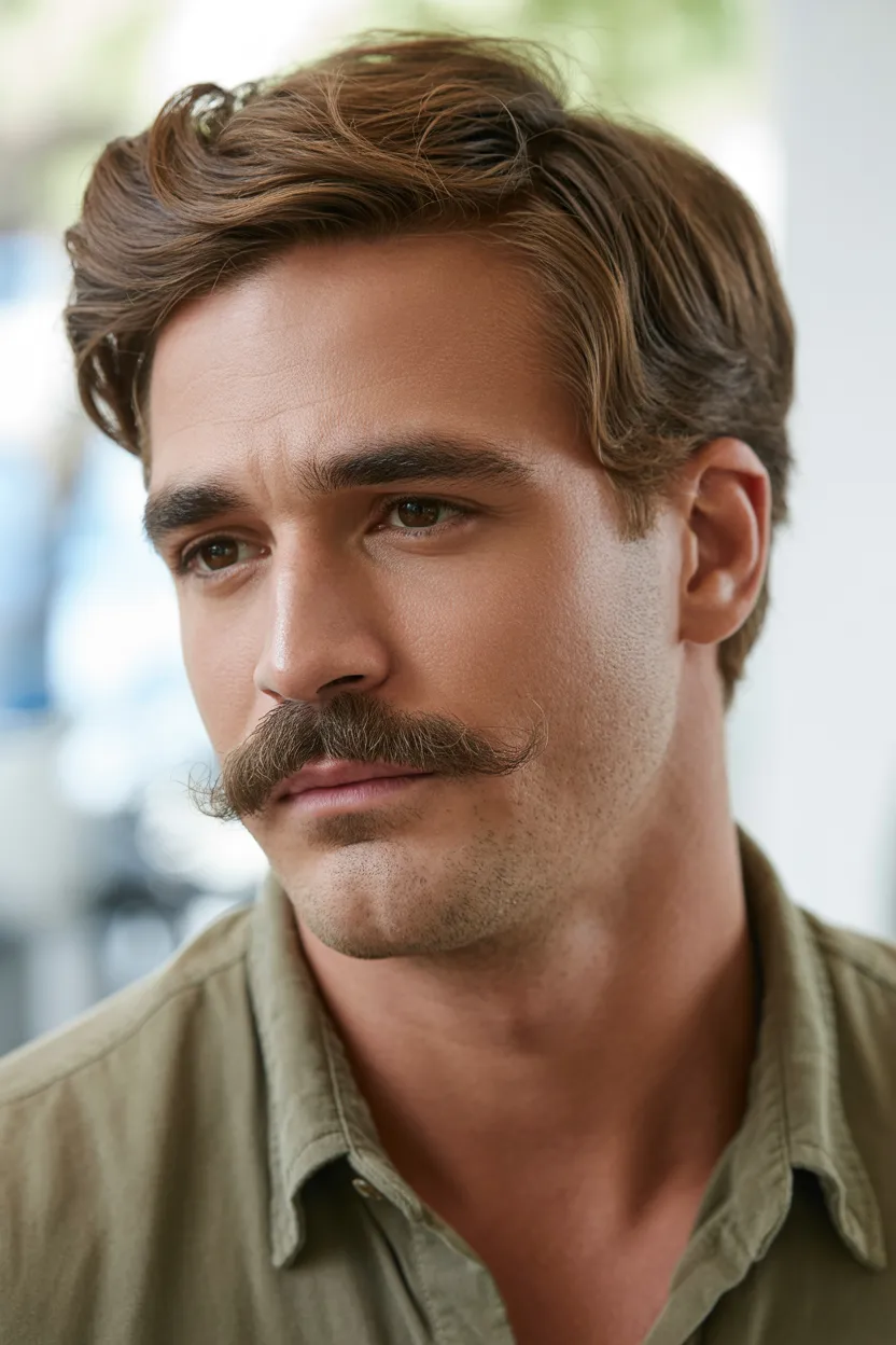 A lot of men should start here before trying bigger styles. Why? Because it gives you shape and presence without demanding too much maintenance or confidence. If you are new to mustaches, this one gives you room to test the waters without jumping straight into facial hair theater.