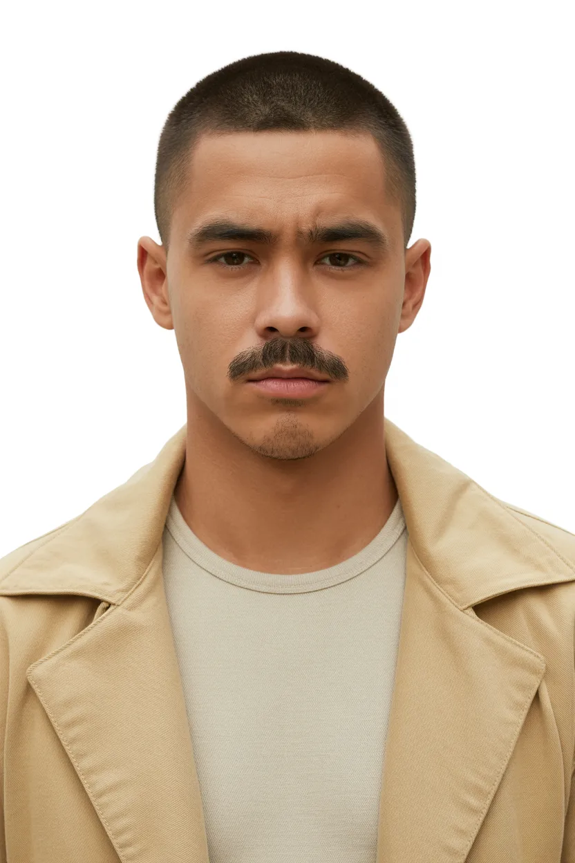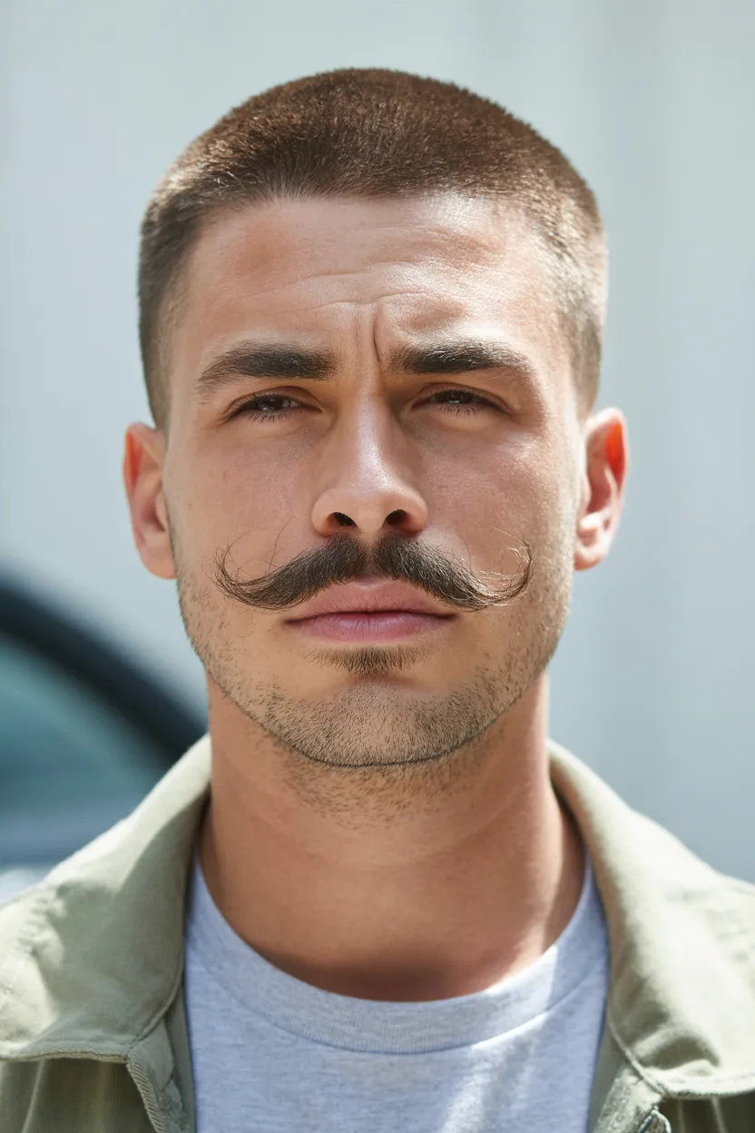 The Short military mustache stays compact, neat, and disciplined. It does not grow too wide, and it never hangs low over the lip. Everything about it looks controlled.