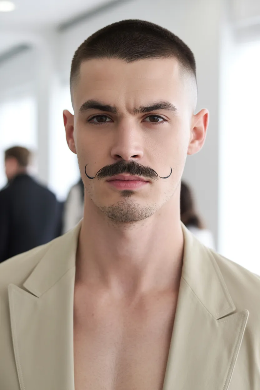 Personally, I think most men should skip the risk and choose another short mustache style instead. But if you really want a minimalist look, make sure it stays balanced, soft, and clearly modern. This is one area where “edgy” can go wrong fast.