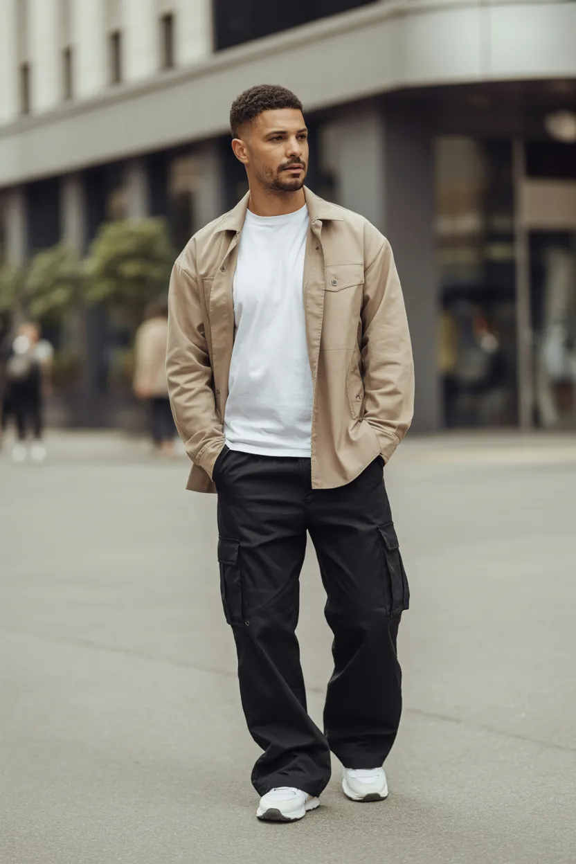 Spring cargo outfits should feel lighter and less heavy. Khaki, stone, beige, and lighter olive cargos work really well. Pair them with plain tees, overshirts, lightweight jackets, or polos.