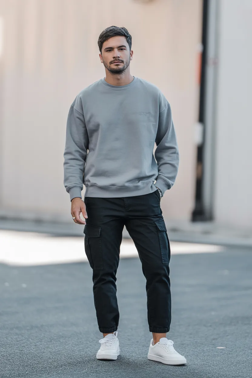 A plain crewneck in grey, cream, navy, black, or forest green works best. Match it with black or olive cargos, then finish with white sneakers or darker casual shoes. The sweatshirt keeps the top half neat, while the cargos add detail and shape to the bottom half.