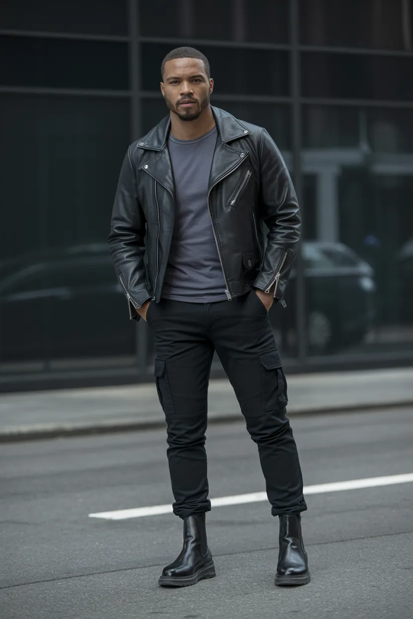 Black cargo pants work best here because they match the cleaner, tougher feel of the leather jacket. A dark olive pair can also work if the jacket and shoes stay sleek. Underneath, wear a plain T-shirt in white, black, or charcoal. That’s enough. You do not need ten layers or dramatic accessories.