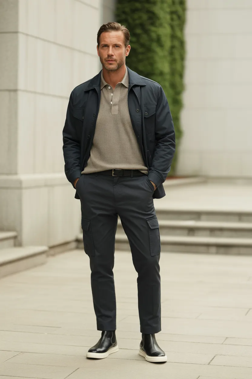 Start with black, navy, beige, or charcoal cargos in a tapered fit. Then pair them with polos, knitwear, overshirts, or casual button-downs. Finish with leather sneakers, loafers, or Chelsea boots. The cleaner the lines, the better the outfit feels.