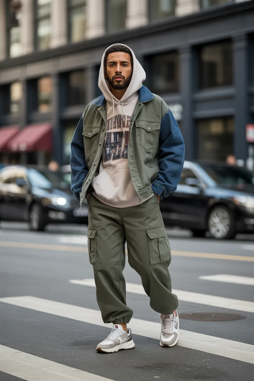 Relaxed-fit cargos work best here. Pair them with oversized tees, hoodies, puffers, bombers, or graphic tops. Then add bold sneakers, a cap, or a crossbody bag if that matches your personal style. The key is keeping the look coordinated rather than chaotic.