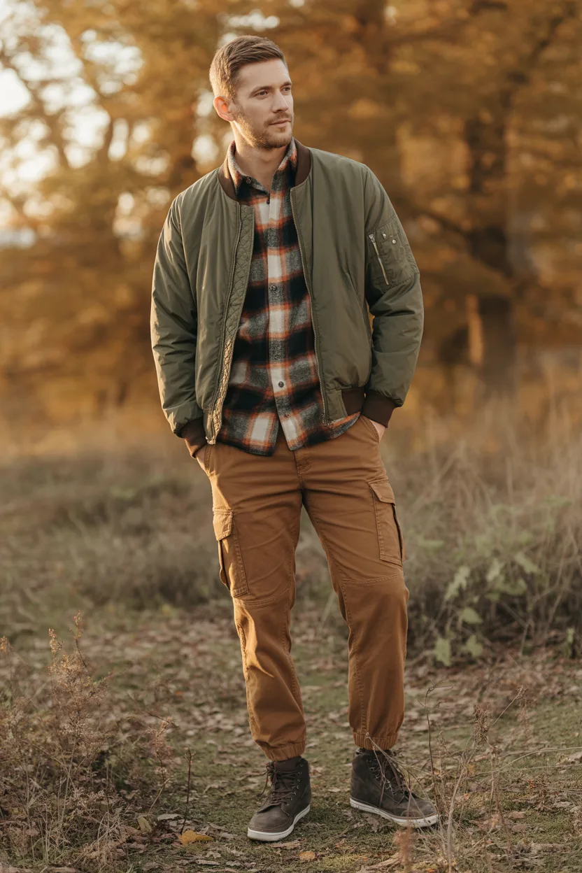 Olive, brown, black, and charcoal cargo pants feel especially right in fall. Add a bomber jacket or flannel, and the whole outfit instantly looks stronger. This season gives cargos room to show off a little.