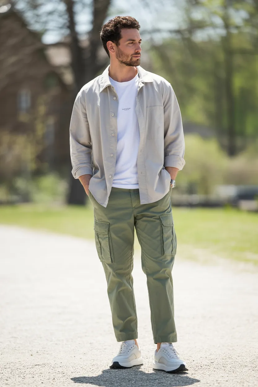 A white tee, olive cargos, and a beige overshirt make a really good spring outfit because the colors feel fresh without trying too hard. Clean sneakers finish the look perfectly.