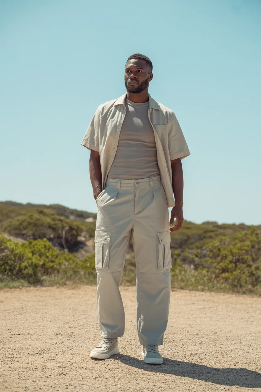 Keep summer cargo outfits light, breathable, and simple. Heavy boots, thick hoodies, and dark layers usually make no sense when the weather feels like a frying pan.