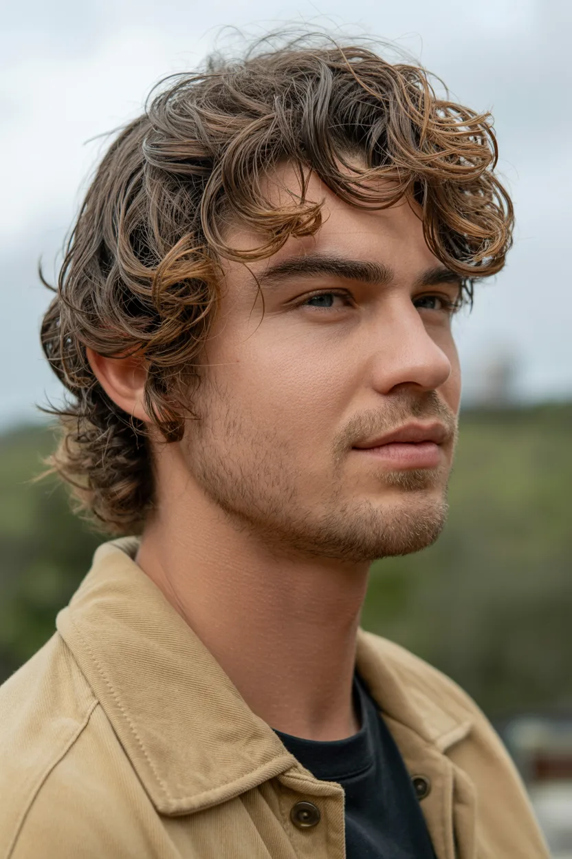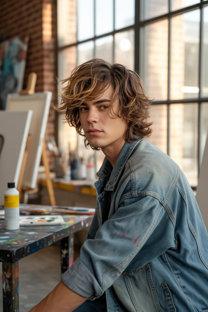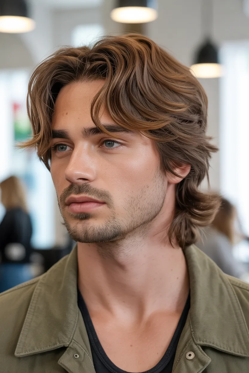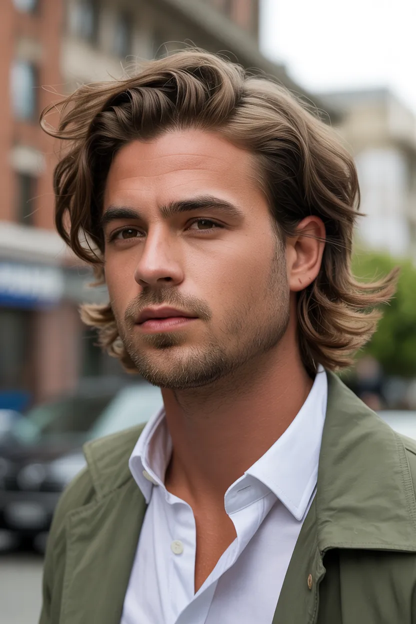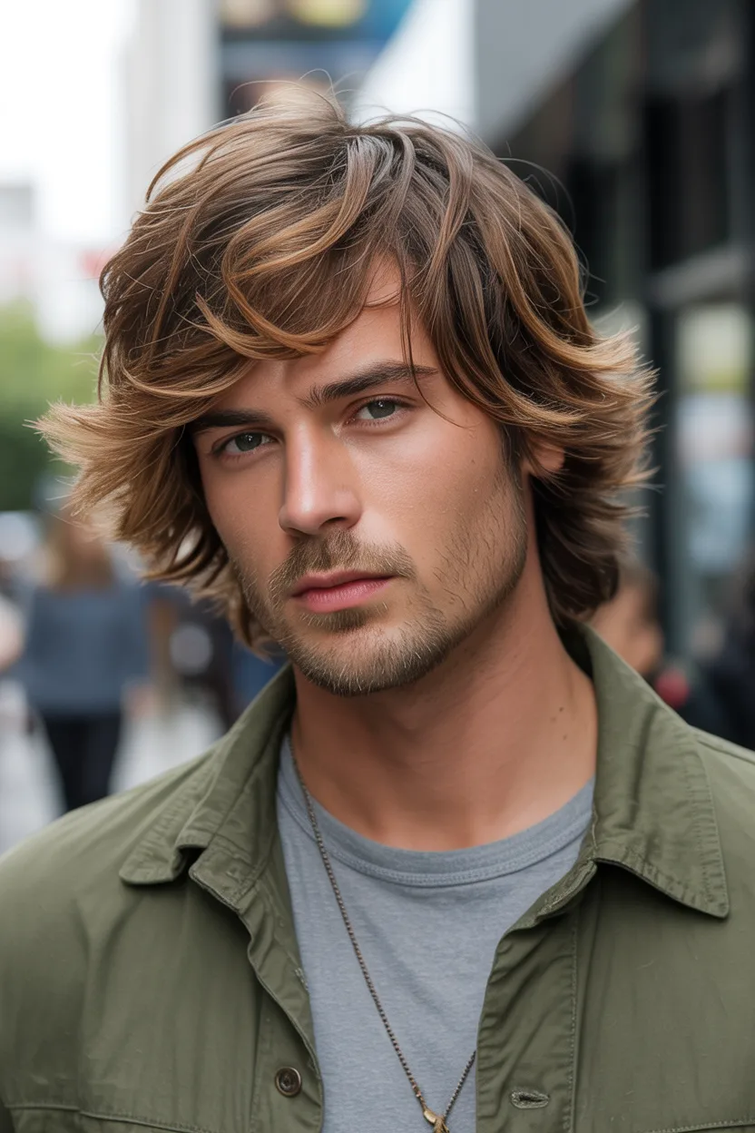 The shaggy medium cut brings texture, layers, and a bit of that effortless cool energy. It works really well on men with thicker hair or natural wave because it gives the hair space to move.