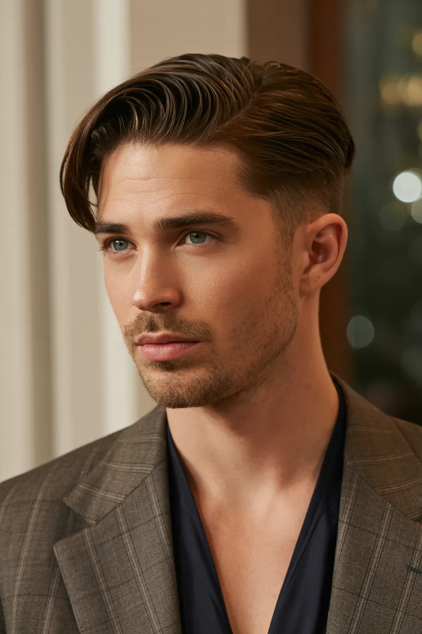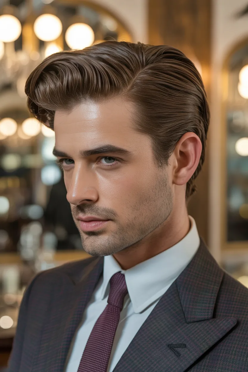 The classic Hollywood sweep has that old school charm that still looks amazing now. It uses medium length hair, a deeper side direction, and a soft swept back shape to create a polished, masculine finish.