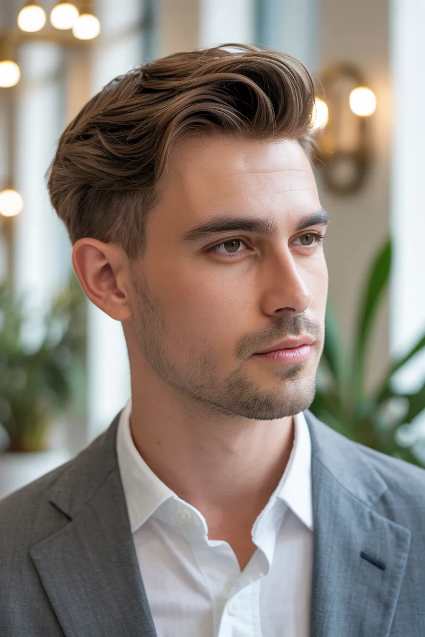 This haircut works well if you like a mature, clean look but do not want too much shine or stiffness. A brush back looks especially good with a taper or scissor cut on the sides. It feels balanced, masculine, and simple to maintain.