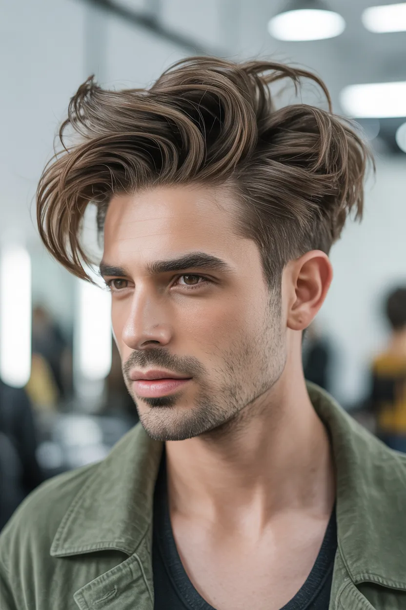 Your barber usually keeps more length on top and shapes it in a way that supports lift. Then you use a blow dryer to guide the hair upward and back or slightly outward. The final look feels energetic but still controlled.