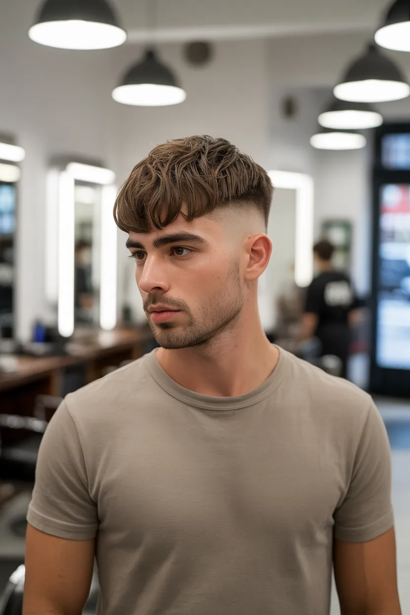 The side swept fringe adds movement to the front of the haircut and creates a more relaxed shape around the forehead. It is a strong choice for men who want something soft and approachable without looking too casual.