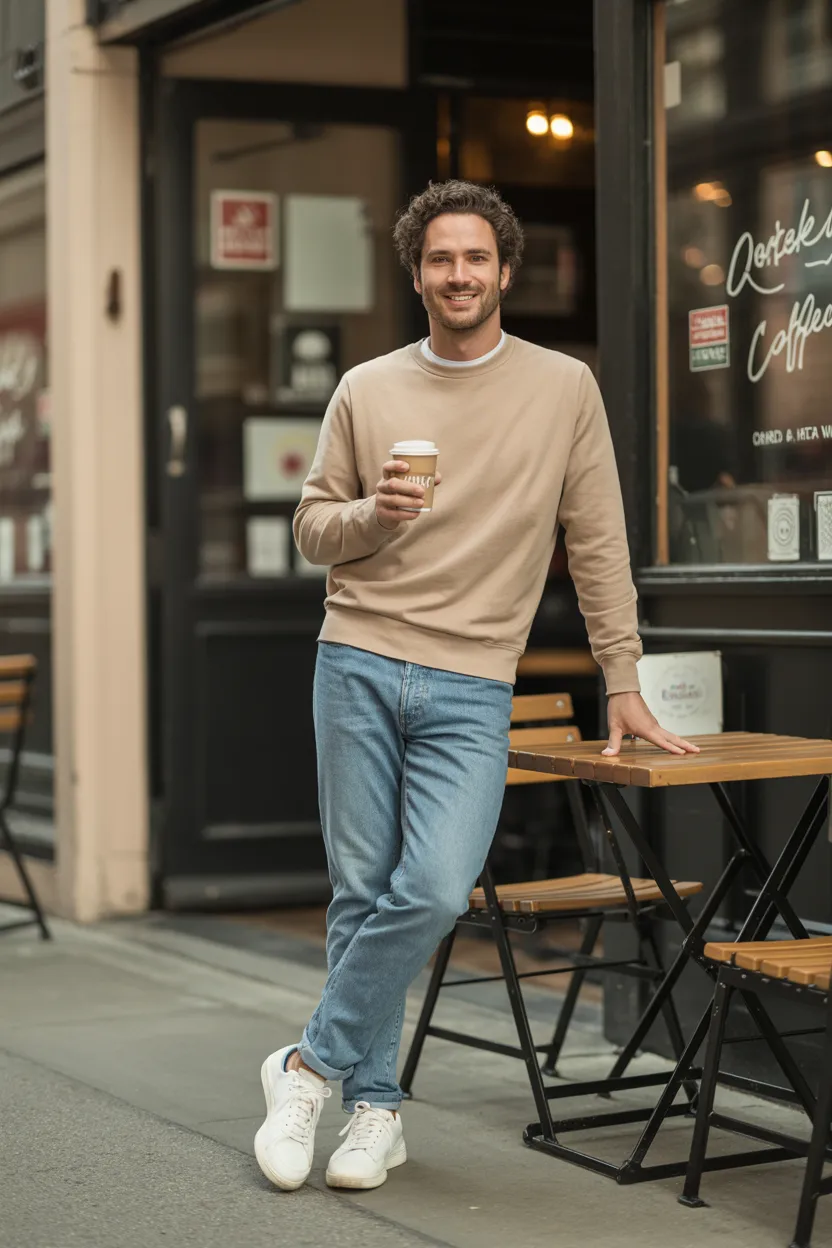 I think this is one of the most dependable coffee date looks a man can have. It works in almost every casual setting and never feels overdone. When in doubt, this combo can save you from making your closet situation way more dramatic than it needs to be.