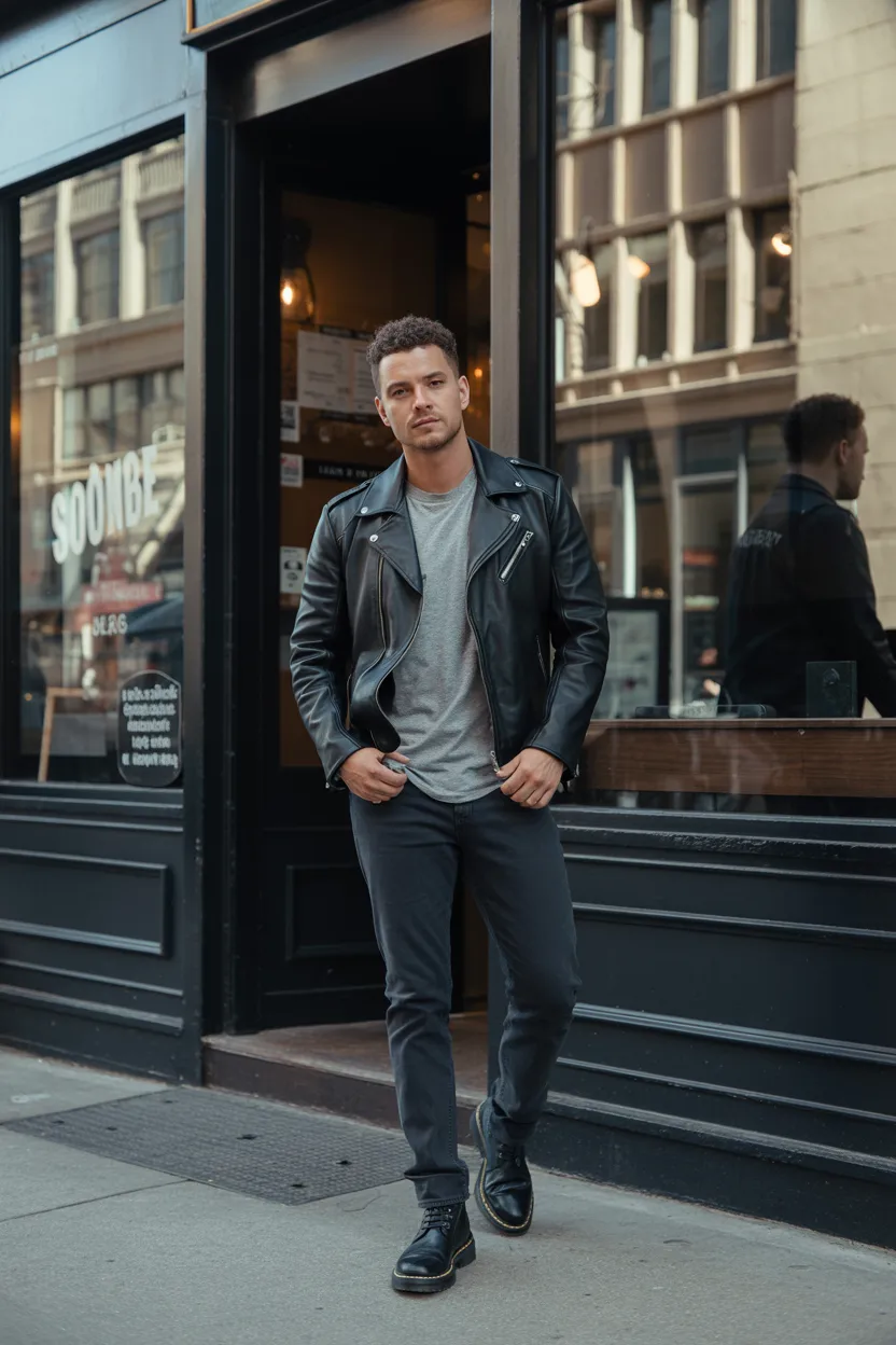 A black leather jacket over a grey tee with dark jeans gives you a more confident, edgy look. It works well if that style already fits your personality. If it does not, forcing it will look obvious.