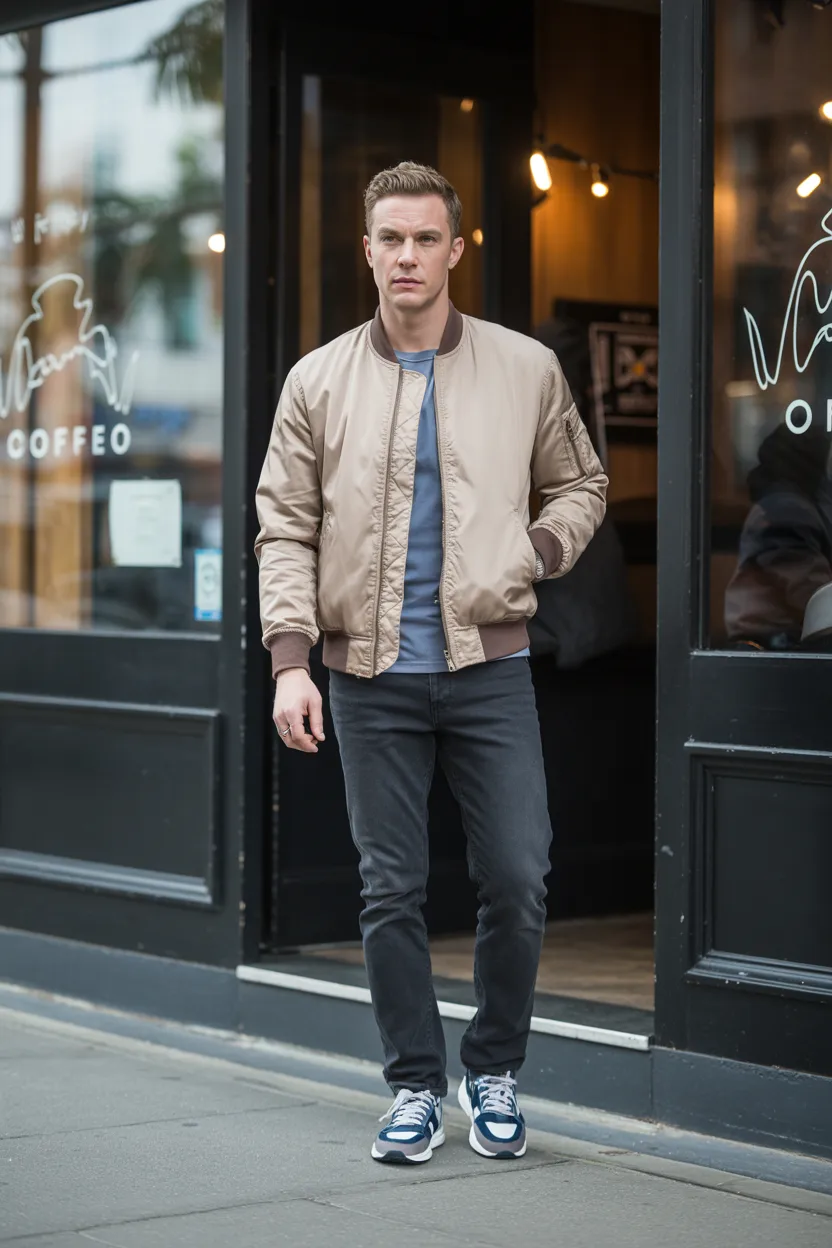 Go for a bomber in black, navy, or olive. Keep it clean and fitted. Bulky jackets can kill the whole vibe.