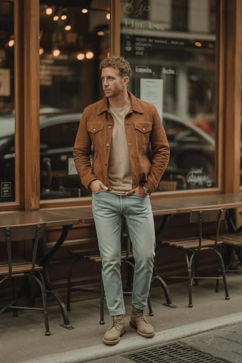 A brown suede jacket instantly upgrades a simple outfit. Wear it over a white, black, or cream tee with jeans or chinos, and the whole look feels richer. One good jacket really can do half the job for you.