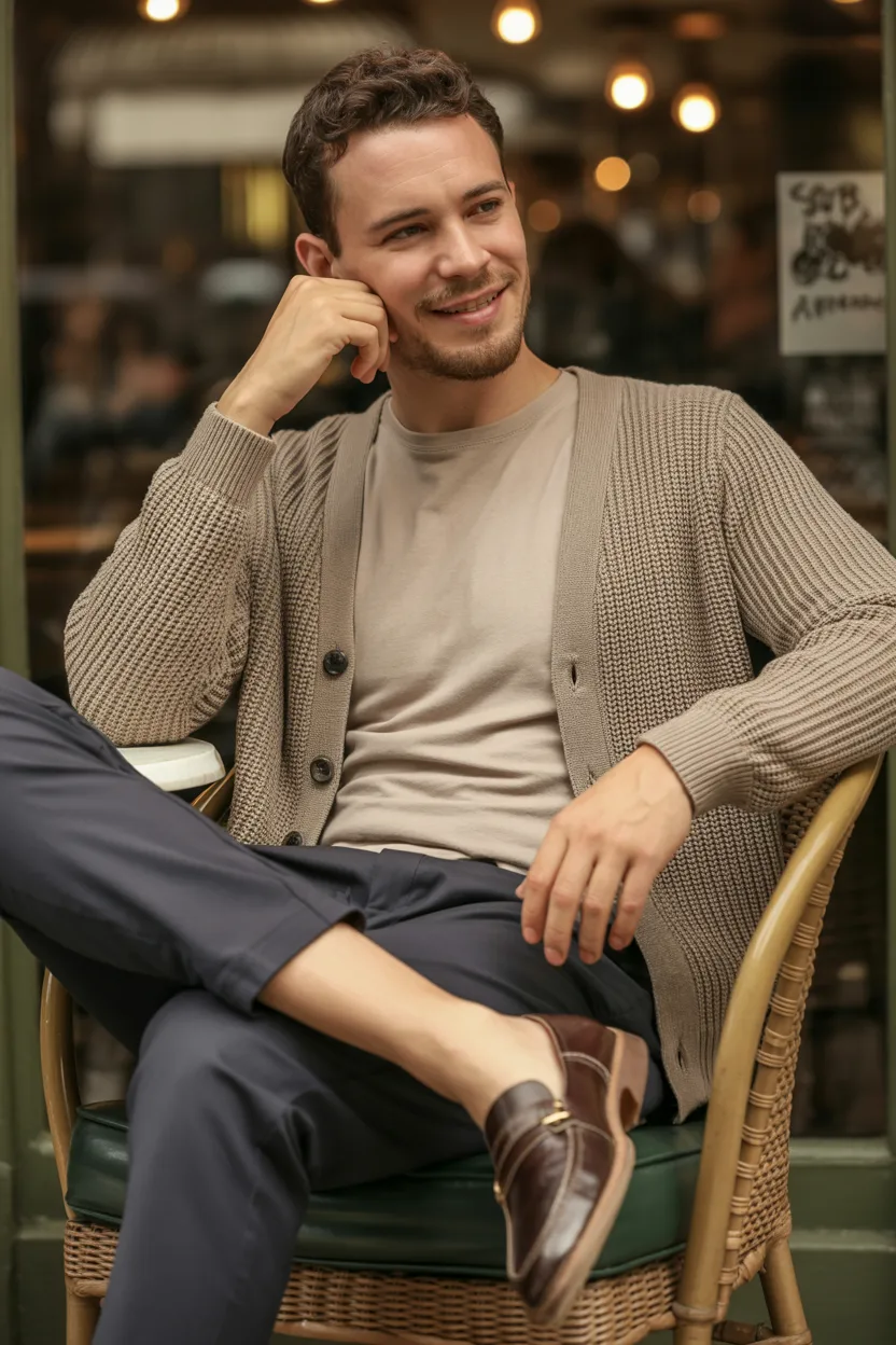 A cardigan over a plain tee with slim pants can look surprisingly stylish on a coffee date. It feels soft, thoughtful, and a little different from the usual jacket-based outfits.