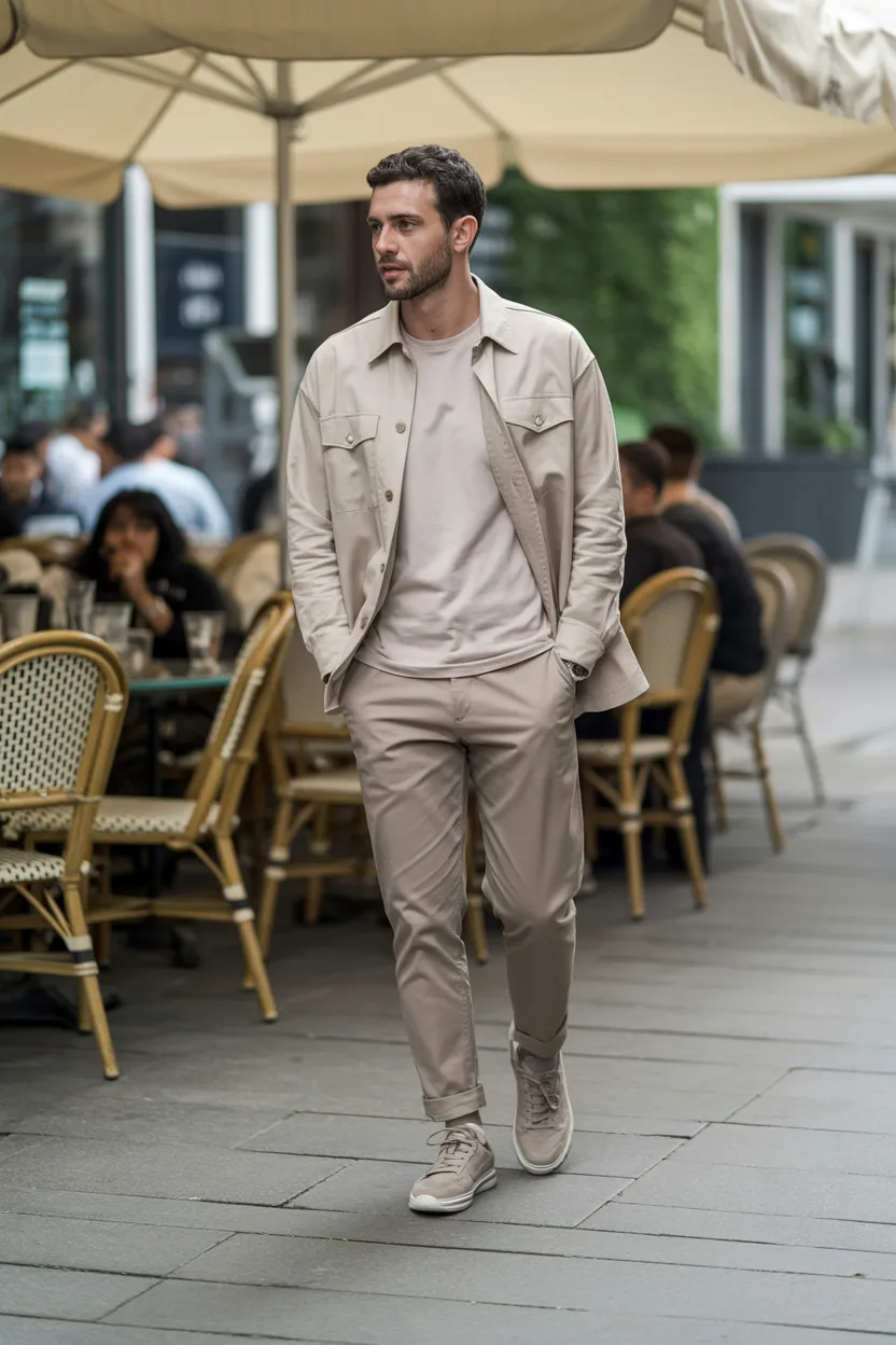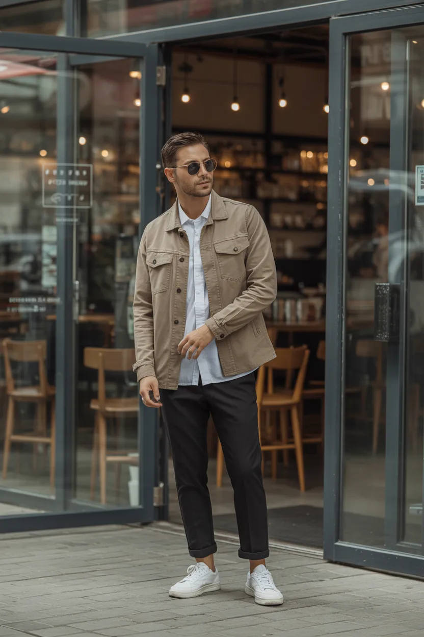 A neutral overshirt over a plain T-shirt with chinos gives you a layered look that feels current and effortless. It is stylish without trying too hard, which is exactly where you want to be on a coffee date.