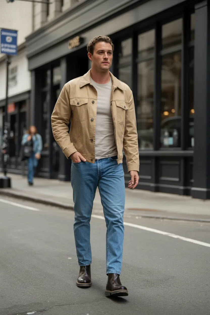 A classic jacket, plain tee, well-fitted jeans, and boots still work for a reason. This combination feels timeless, masculine, and easy to wear. Some outfits become classics because they earn it.