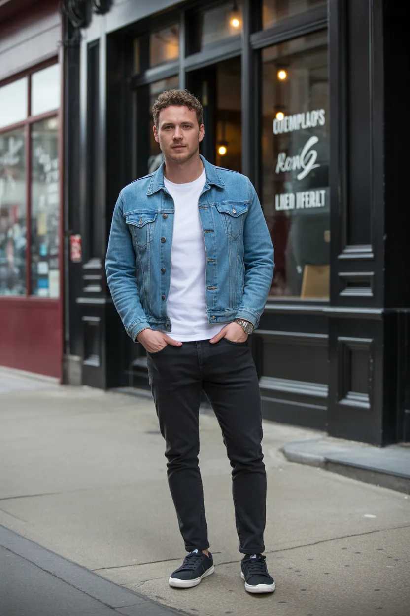 A denim jacket, white tee, and black jeans create one of the easiest confident outfits a guy can wear. It feels casual, masculine, and natural. That matters because coffee dates should not feel costume-level serious.