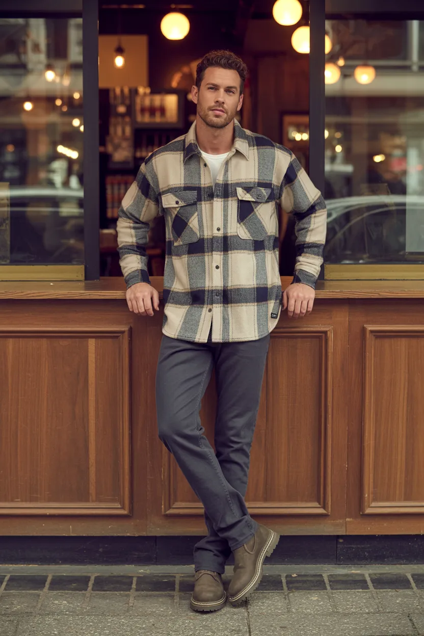 A flannel shirt with dark denim gives you a comfortable, approachable look that still feels masculine and confident. It is ideal for casual cafés, cold weather, or laid-back weekend dates.