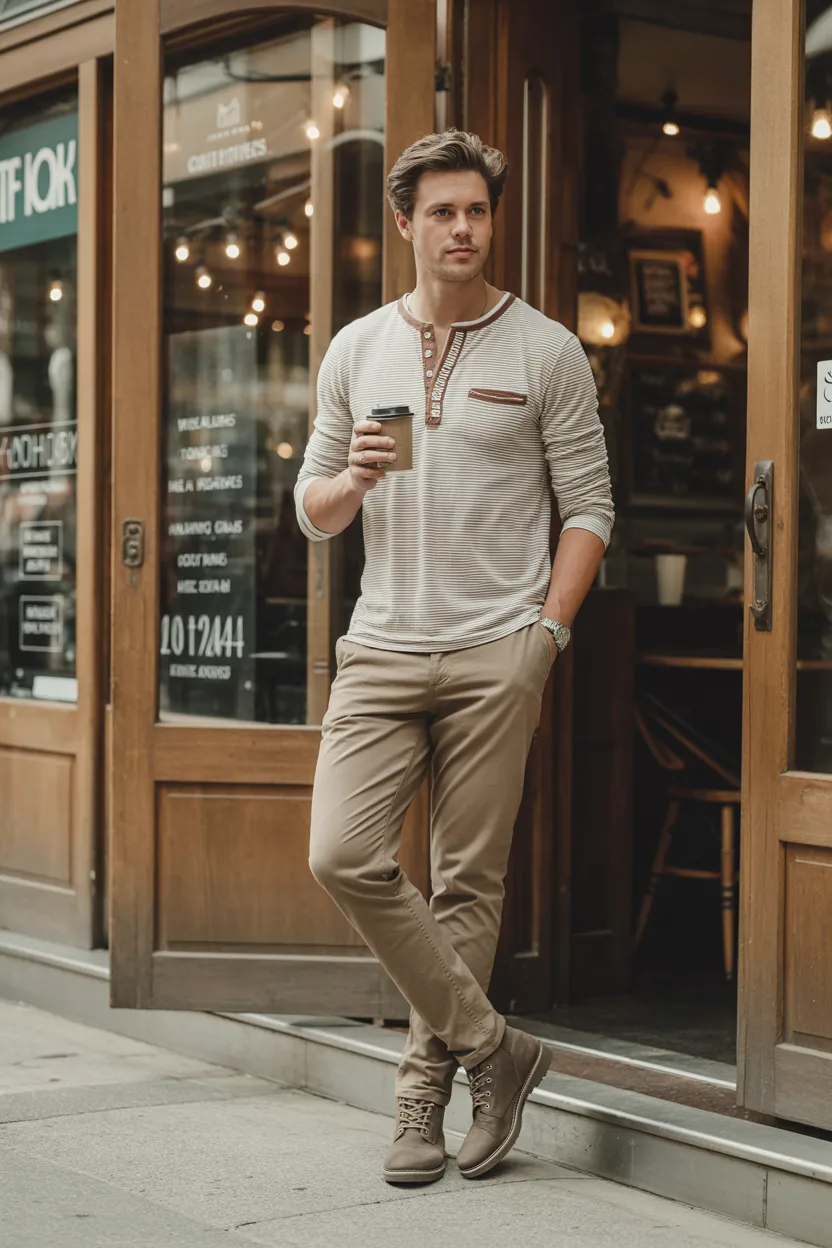 A Henley shirt with chinos gives off a relaxed, slightly rugged look that feels confident without being loud. It is a great option if you want something more interesting than a basic T-shirt but still easy to wear.