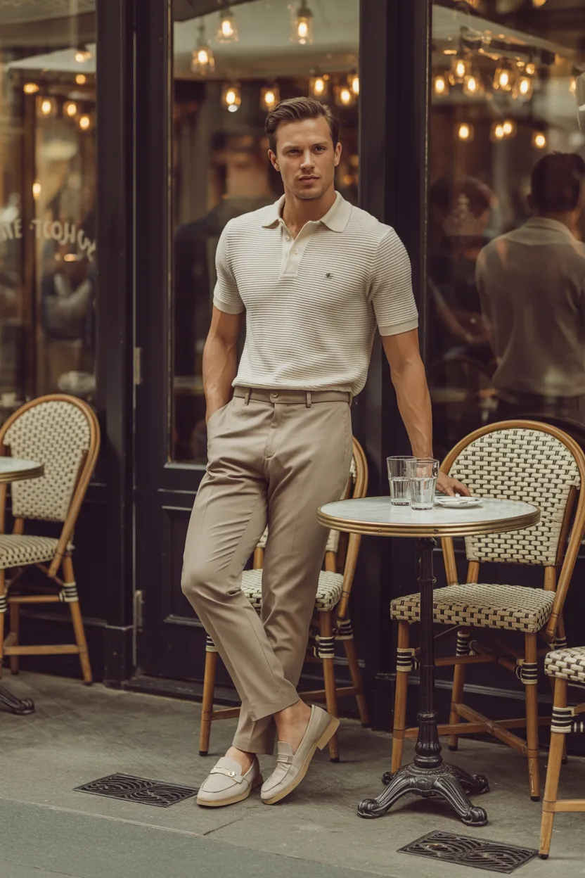 A knit polo paired with slim trousers looks polished in a subtle way. It feels richer than a standard polo and more relaxed than a formal shirt. That middle ground makes it great for a nice coffee date spot.