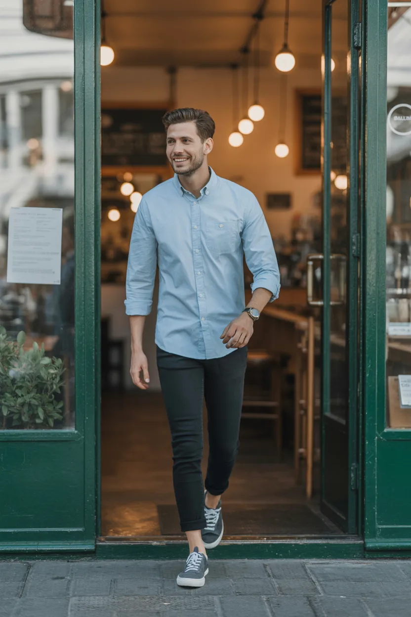 A light blue button-up with black jeans gives off a calm, polished vibe. It feels approachable and clean, which makes it a great choice for first dates. Ever notice how blue somehow makes people look more trustworthy? It just does.