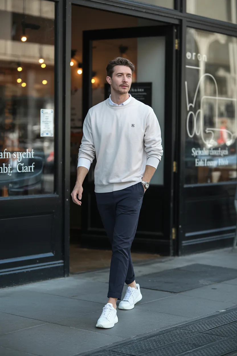 A minimalist sweater with dark pants or jeans and white sneakers gives you one of the cleanest looks on this list. It feels modern, relaxed, and quietly stylish.
