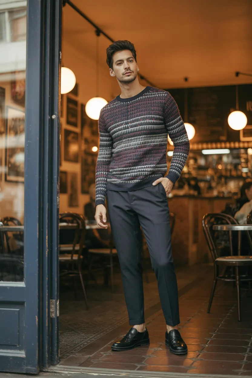 A patterned knit or textured top with dark pants adds personality without becoming loud. It is a great choice if you want your outfit to feel a little more interesting while still looking clean and confident.