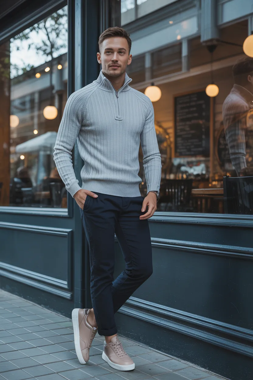 A quarter-zip sweater with dark pants gives you a clean, modern look that feels slightly polished but never too formal. It is a reliable coffee date outfit, especially in cooler months.