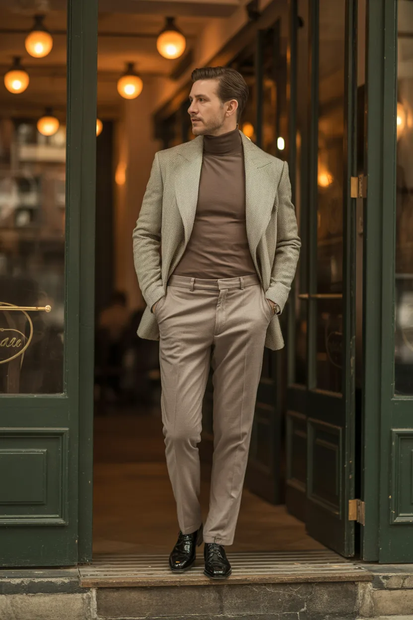 A fitted turtleneck with wool trousers creates a mature, confident look right away. It feels sleek, warm, and well put together. This outfit works especially well in cooler weather or at slightly more upscale coffee spots.
