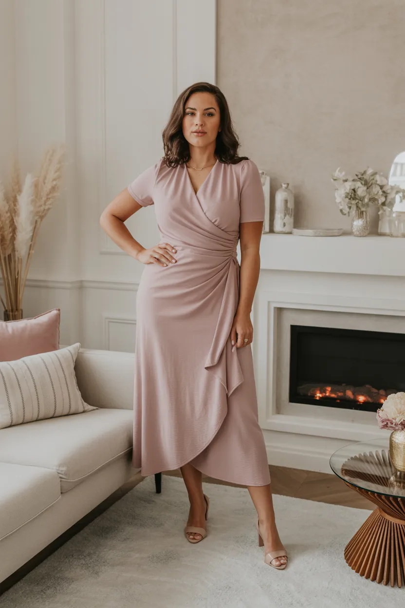 Wrap dresses flatter apple shaped bodies because they create a waist without squeezing the middle too hard. They also highlight the bust in a balanced way and let the fabric move across the body instead of sticking to it. That diagonal wrap detail does a lot of heavy lifting, and thankfully it does not complain.