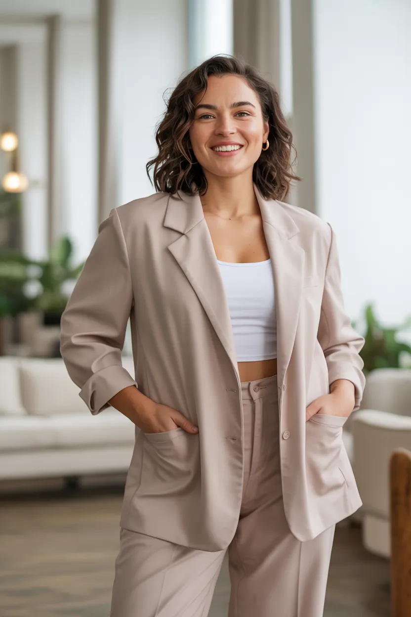 The right blazer sharpens the shoulders, skims the waist area, and adds polish without clinging. It also helps create a more defined outline, especially when worn open over a simple top. I love this trick because it works for casual outfits, workwear, and even dinner looks.