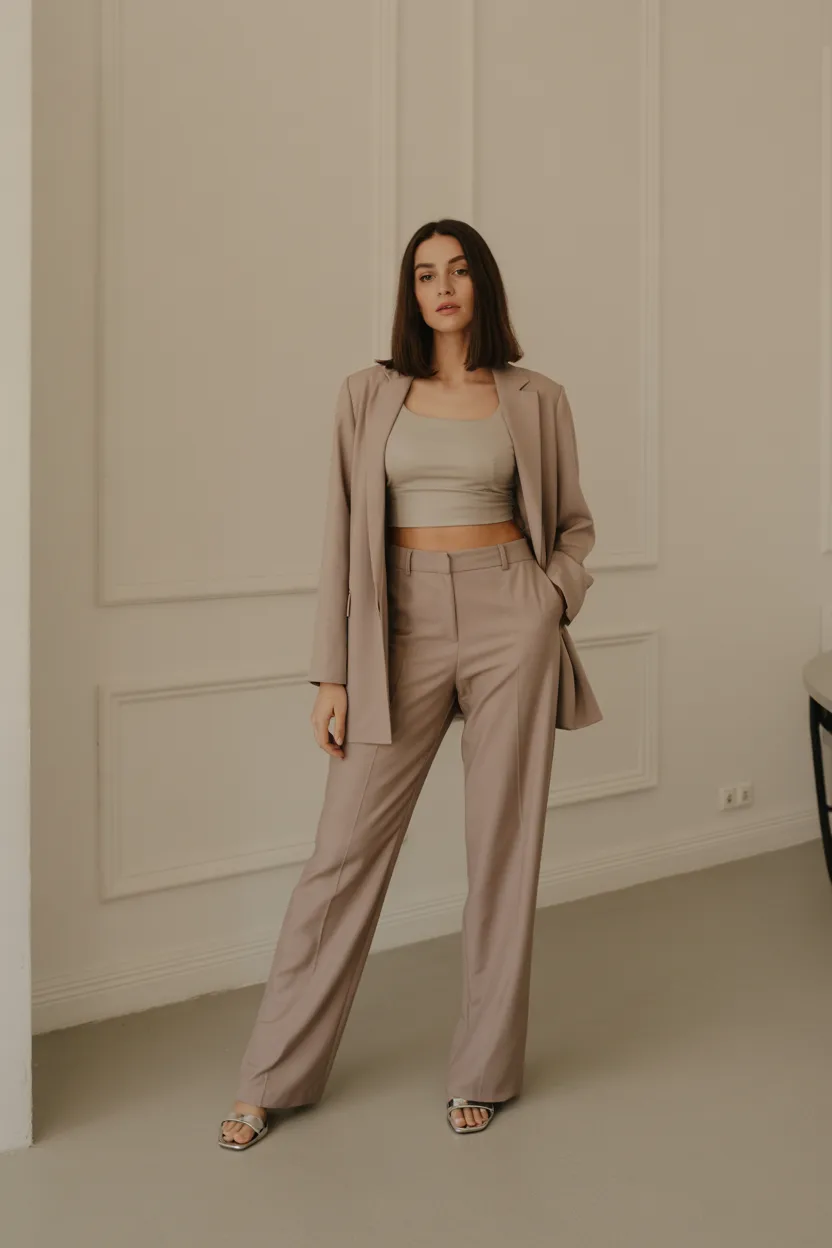 • Beige tunic + beige wide-leg pants