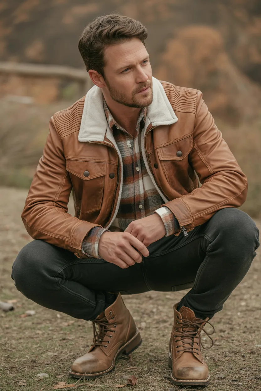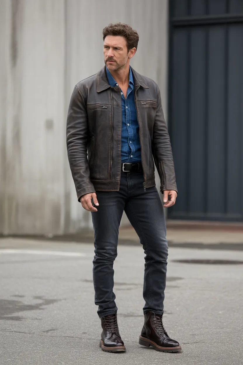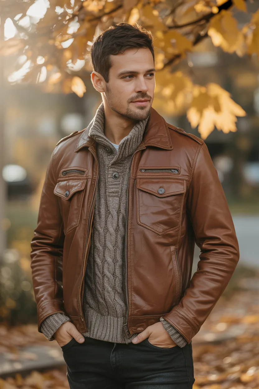 A brown leather jacket with a henley and dark jeans gives you a more rugged and mature look. It feels warmer than black and often works really well in fall, early winter, and cooler spring days.
