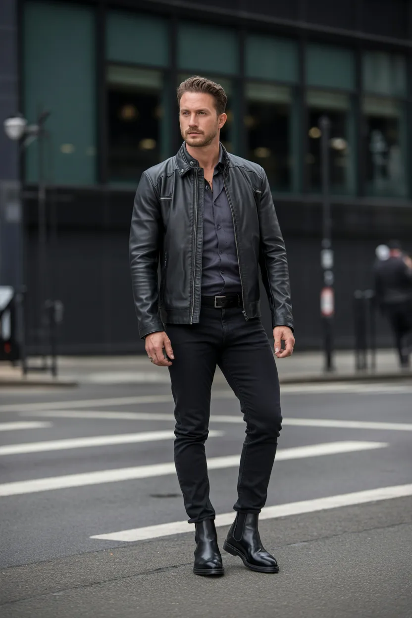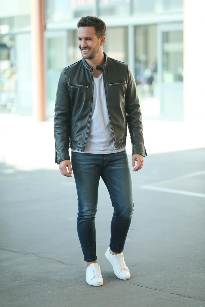 This outfit is the classic for a reason. A black leather jacket with a white T shirt and blue jeans looks sharp, simple, and timeless. It works on younger guys, older guys, slim guys, broad guys, and pretty much anyone who likes looking put together without making a big fuss.