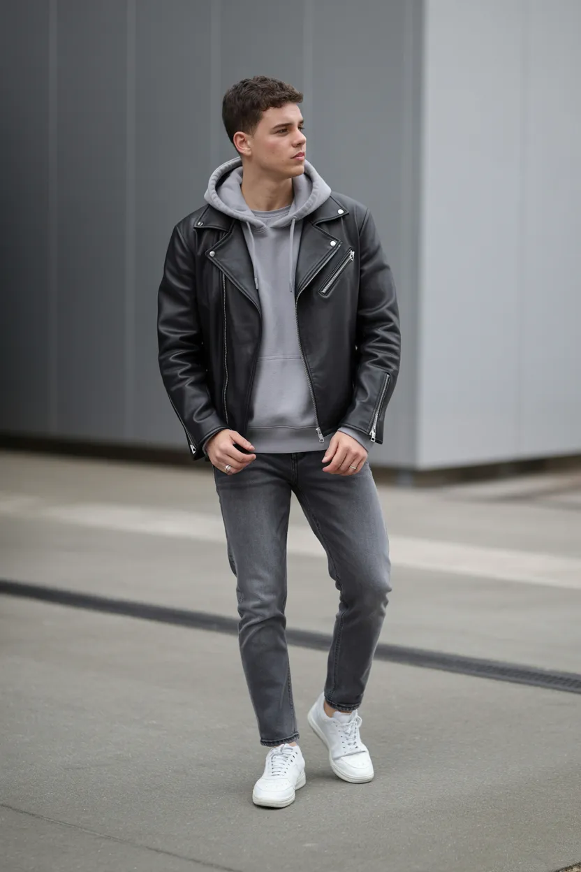 I usually like a gray hoodie under a black leather jacket because it creates nice contrast without trying too hard. Clean, simple, and actually wearable. A rare trio.