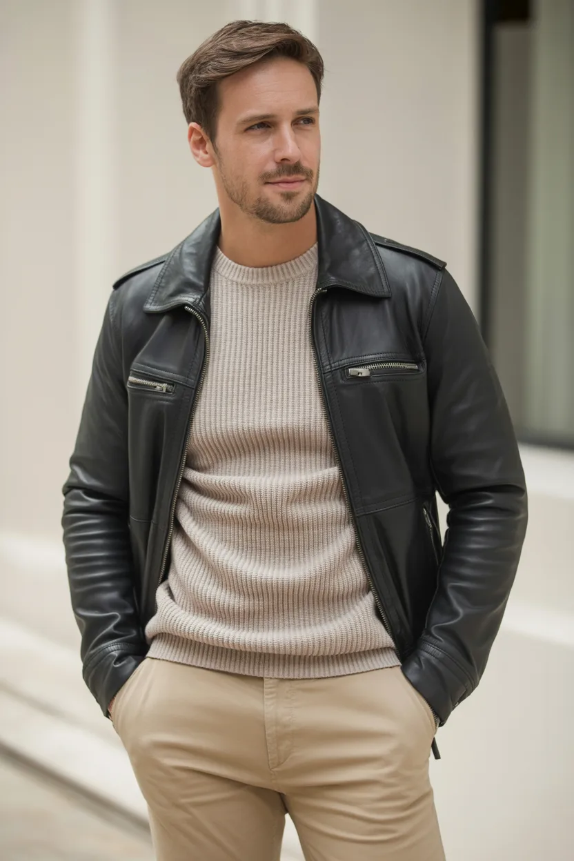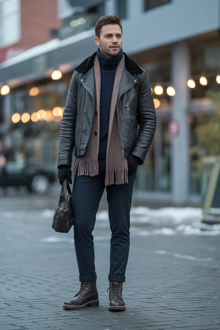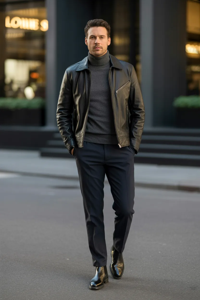 A leather jacket with a turtleneck and wool scarf looks especially good in winter. It feels clean, masculine, and seasonal without getting too fussy.