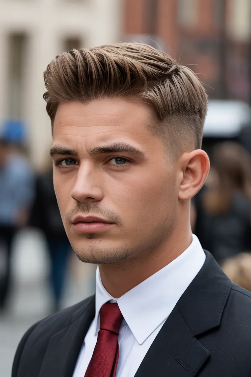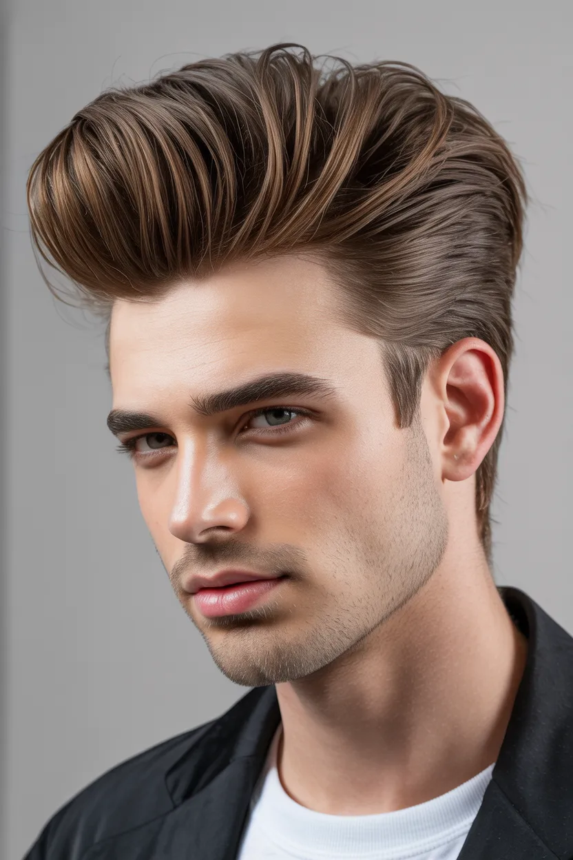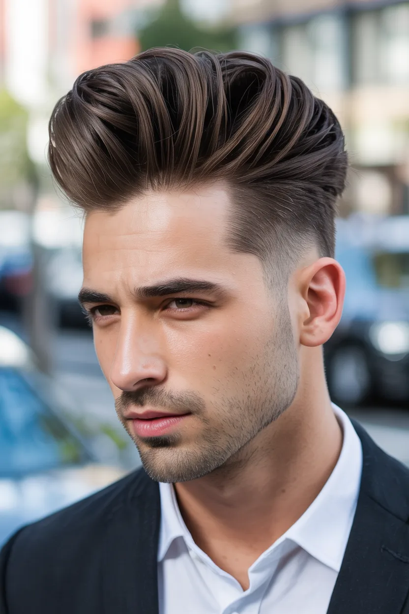 The brush up hairstyle lifts the hair upward and slightly back for a fresh, confident look. It feels clean, modern, and a little more relaxed than a full pompadour.