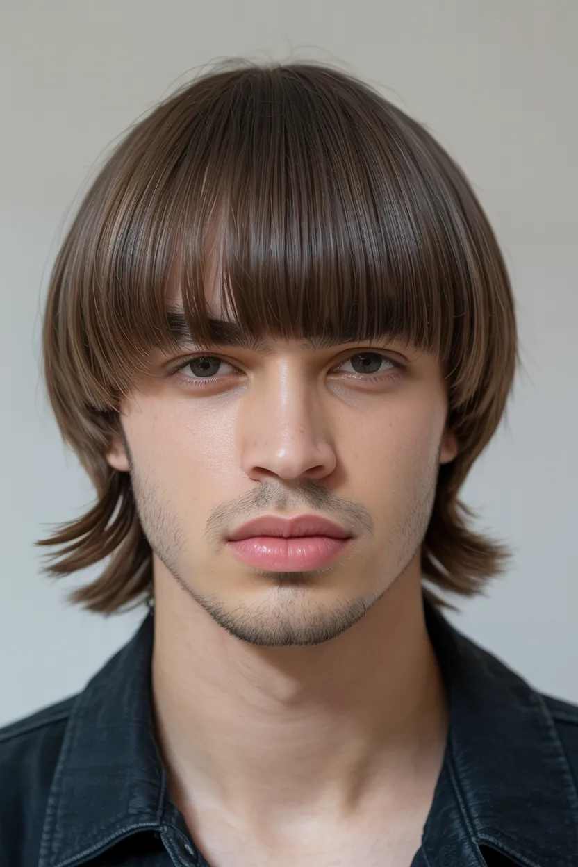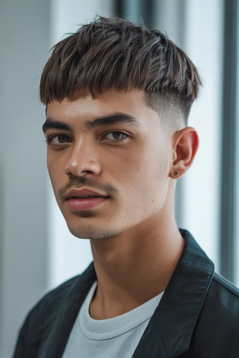 This haircut can look great if you want something softer than a quiff or side part. Straight hair helps the fringe fall neatly, which makes the overall cut look more intentional.