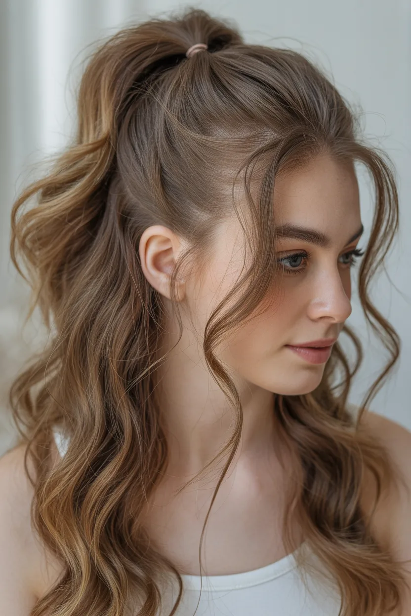 This ponytail works especially well with waves, curls, and layered hair. The top section adds volume at the crown, while the loose bottom half keeps the overall look soft and pretty. It feels youthful, cute, and very easy to wear.