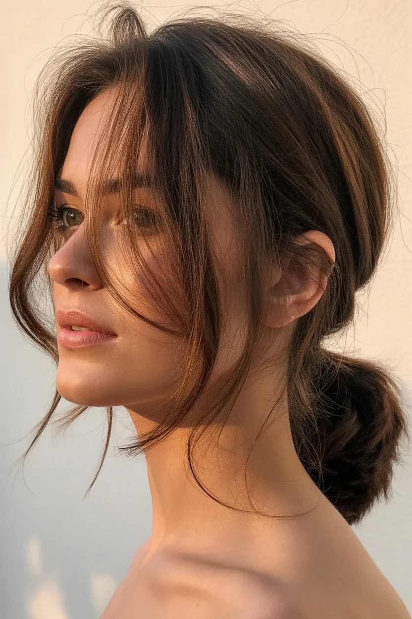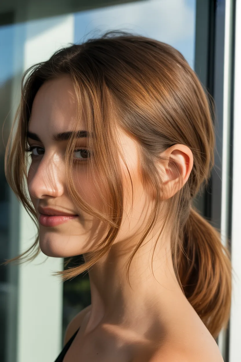 A ponytail with face framing pieces looks softer and more flattering on a lot of people. Those loose sections around the front help shape the face and keep the style from feeling too severe. Ever notice how two little strands can somehow change everything? Hair really loves being dramatic.