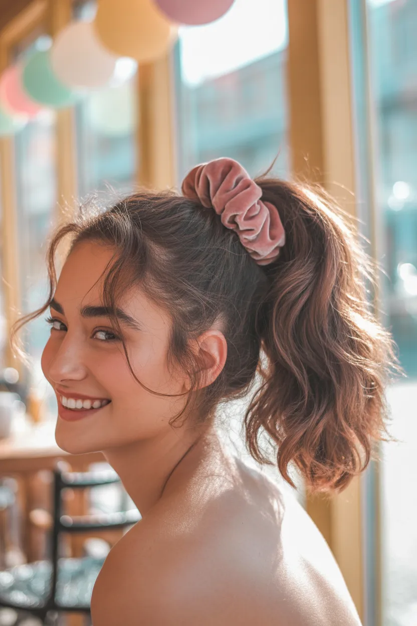This ponytail works well high, low, sleek, or messy. You can match the scrunchie to your outfit or choose a contrasting color to make it stand out. Either way, it adds personality in about two seconds.