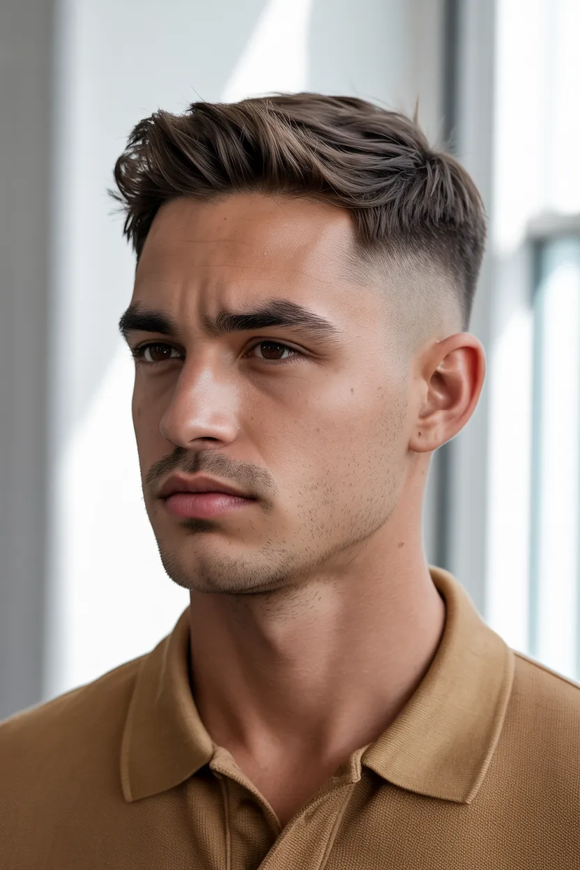 This haircut gives you an easygoing look that still feels styled. The top stays short but textured and slightly messy, while the sides taper down neatly.