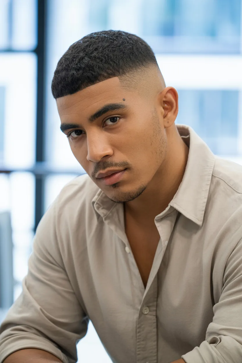 A skin fade with a short top creates strong contrast because the sides go all the way down to the skin. That makes the haircut look extra clean and bold.