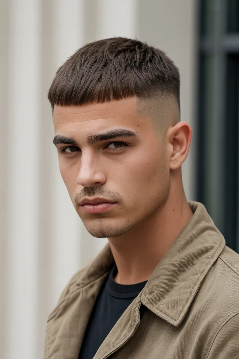 The brush cut looks similar to a crew cut, but it leaves enough length on top so you can brush it slightly upward. That extra length gives the haircut more flexibility and a bit more texture.